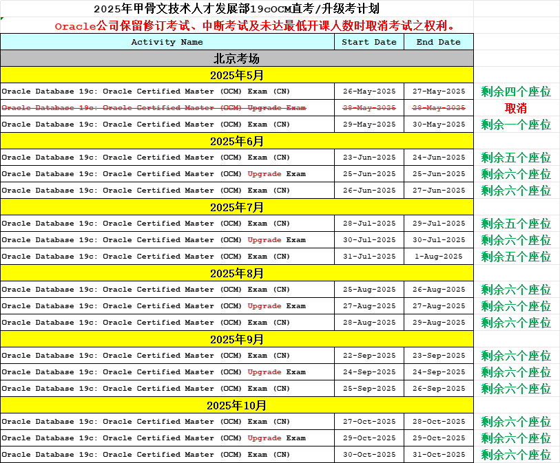 2025年,甲骨文技术人才发展部发布了针对Oracle Database 19c的OCM直考与升级考试计划,涵盖上海和北京两大考场。具体安排如下: